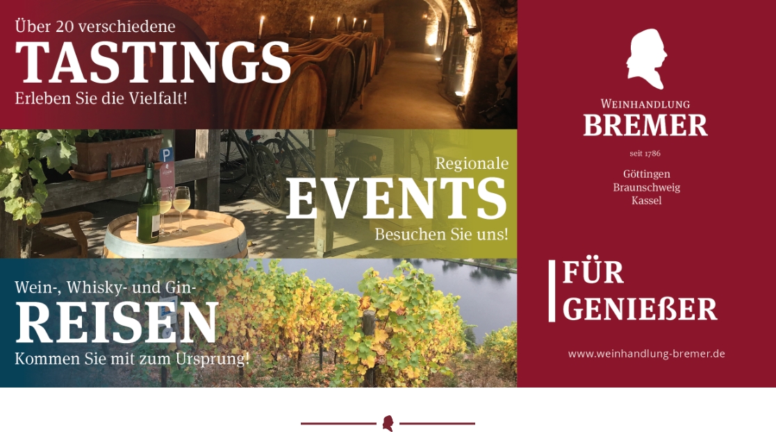 Bremer ist immer wieder Ausrichter und beliebter Begleiter von Events und Veranstaltungen. Hier finden Sie Veranstaltungen, auf denen Sie das Bremer-Team und Bremer-Weine erleben können. Wir freuen uns auf Ihren Besuch!
